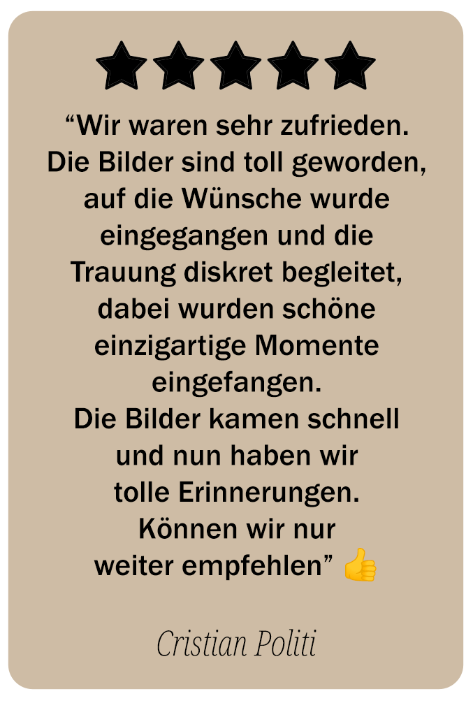- Ein abschließendes Gespräch, in dem das Brautpaar Feedback zur gesamten Erfahrung gibt. Hier können auch weitere Wünsche oder Fragen zur Nutzung der Bilder geklärt werden.
